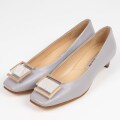 スクエア木型&ローヒールと見た目から履きやすそうなパンプス。バックル飾りに同色の型押しクロコが大人っぽさを演出しています。