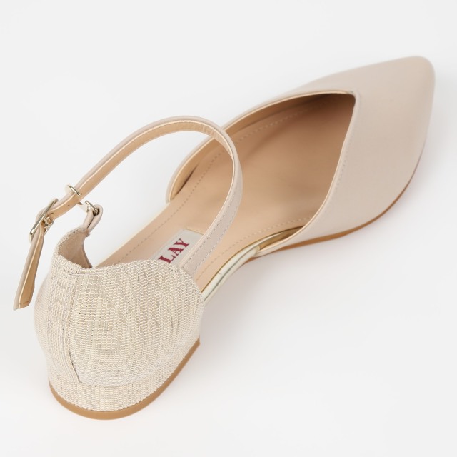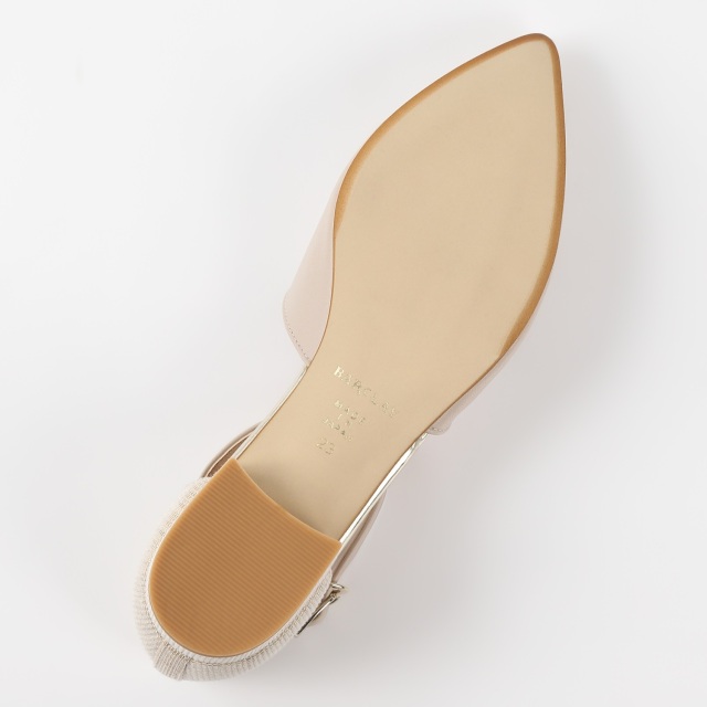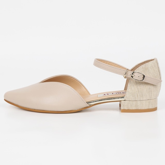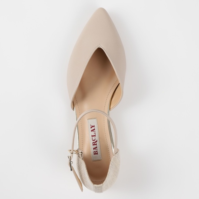 踵回りを生地使いにすることで、軽く素足にも合う夏らしいパンプスに仕上げました。甲のVカットは足をスッキリと見せてくれます。