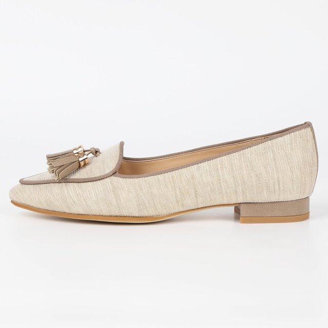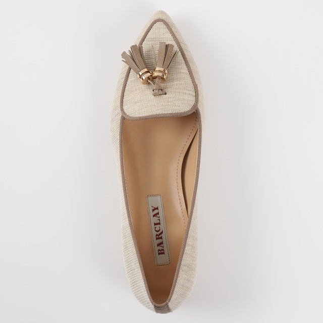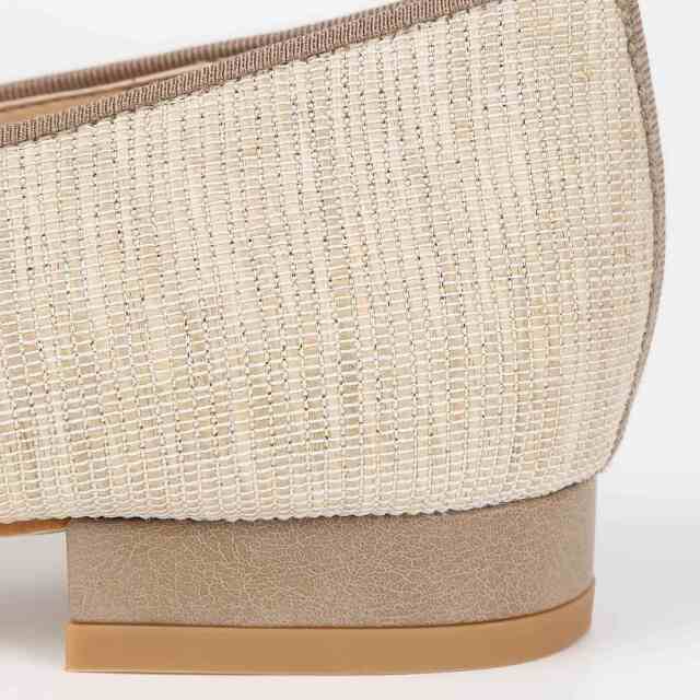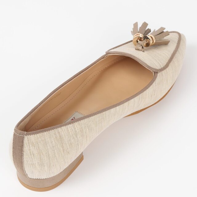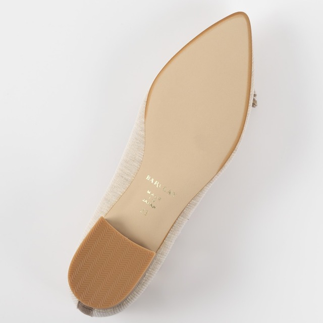 繊細なラメが入った生地使いで夏らしいパンプスに仕上げました。フラットで履きやすく、ソフトポインテッドトゥでキレイめカジュアルのコーディネートに仕上がります。