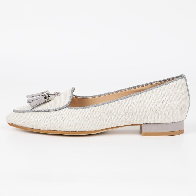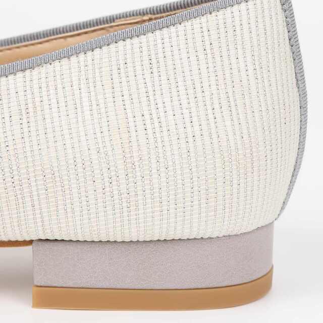 繊細なラメが入った生地使いで夏らしいパンプスに仕上げました。フラットで履きやすく、ソフトポインテッドトゥでキレイめカジュアルのコーディネートに仕上がります。