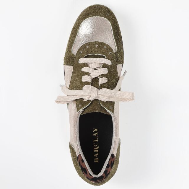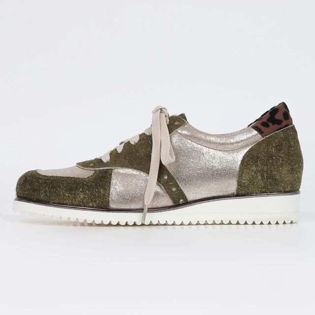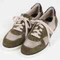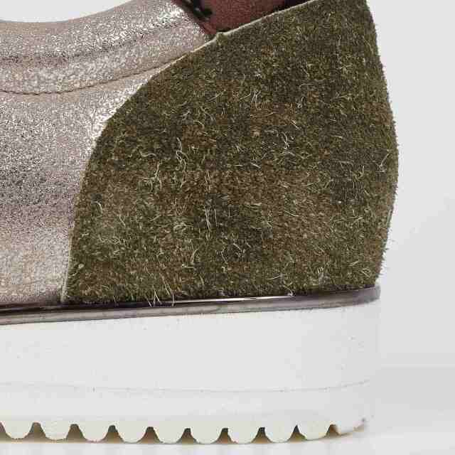 上品に履けるのに適度にカジュアルなアッパーデザイン。スタック風のプリントを施して挟みこみ、シルバーのメッキピースを巻いた他店では見かけないソールデザインです。