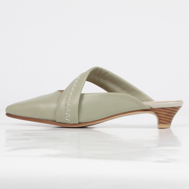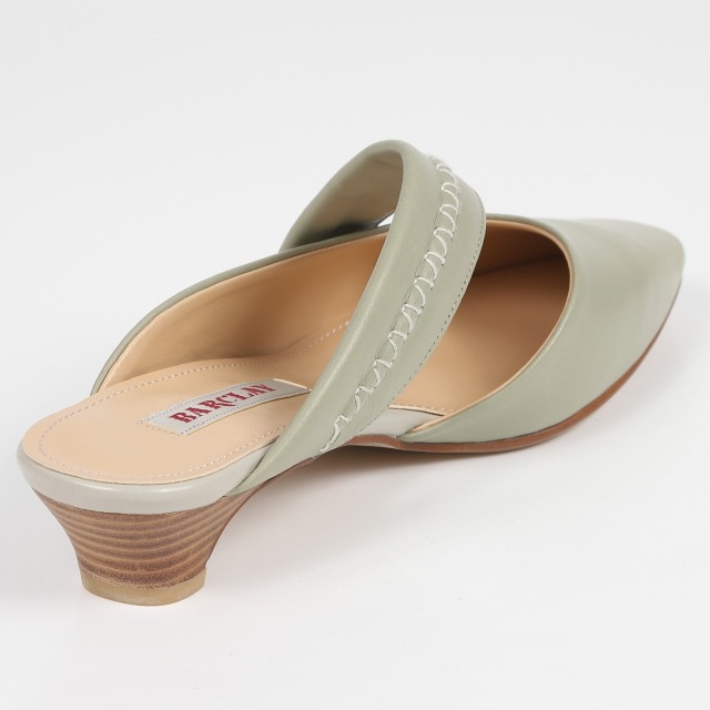 履きやすいミュールデザイン。甲ベルトの飾りステッチでクラフト感をプラスし、今年らしい一足に。甲ベルトにスポンジを入れて足当たりを柔らかく仕上げていますので、甲が深いデザインですが安定して歩行できるように工夫しています。