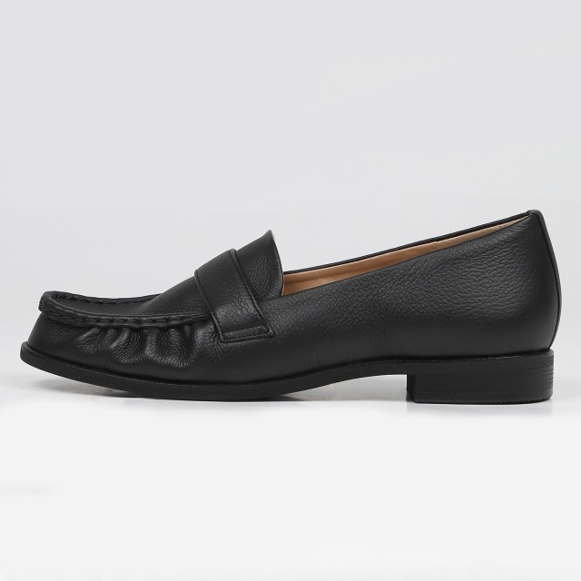 シボ感のあるレザーとギャザーをよせたディテールで柔らかさを表現したソフトローファー。ソフトな革を使用しているので足当たりは柔らかく、クッション性のあるインソールも入っていて、履き心地は抜群です。コーディネートのジャマにならないシンプルなデザインに仕上げました。