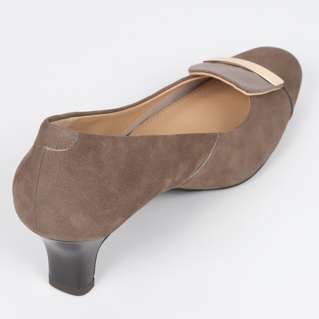 甲の飾りとスクエアトゥがクラシカルを盛り立てるエレガントなパンプス。