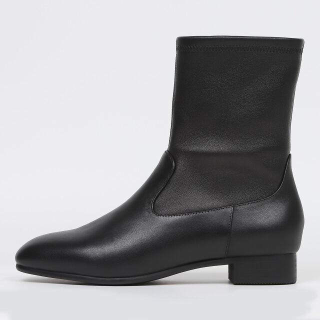 ソフトスクエアなつま先が上品なストレッチブーツ。しなやかな革がフィットしてくれて、脚をキレイにみせてくれます。ミニマルなデザインのヒールタイプは、どんなスタイリングにもマッチしてくれる万能な一足。