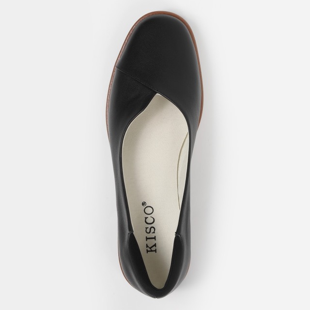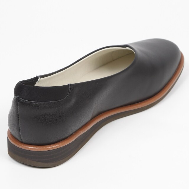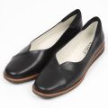 履き口のアシンメトリーなデザインでオリジナリティのあるカジュアルパンプス。深すぎず浅すぎない絶妙なバランスでオールシーズン活躍します。ヒールにスタック風のプリントを施しキチンと感をプラス。ゆったりとした木型を使用しているので、圧迫感がなくストレスフリーに履いていただけます。毎日履きたくなる1足です。