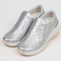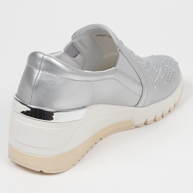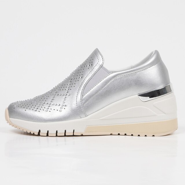 小ぶりのクリアストーンの優しい輝きで上品さのあるヒールスニーカー。7cmヒールのソールとスッキリしたシルエットで、美脚効果が期待できます。履き口両サイドにゴムをつけているので、着脱もスムーズ。