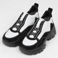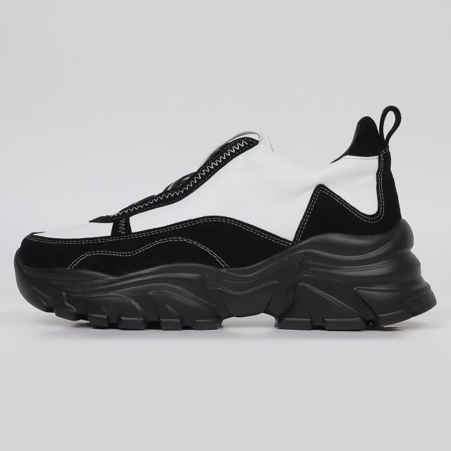 甲のあしらったバイカラーのクロスゴムが目を引くハイカットスニーカー。千鳥ステッチの飾りでクラフト感をプラス。