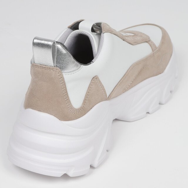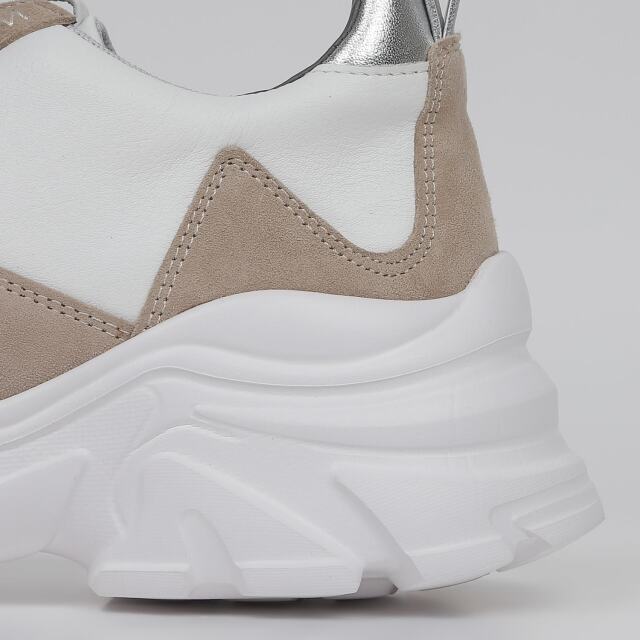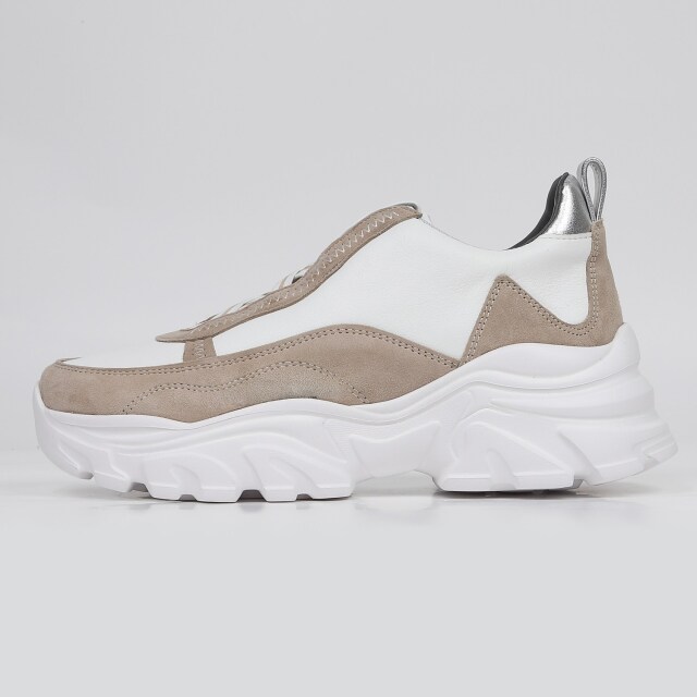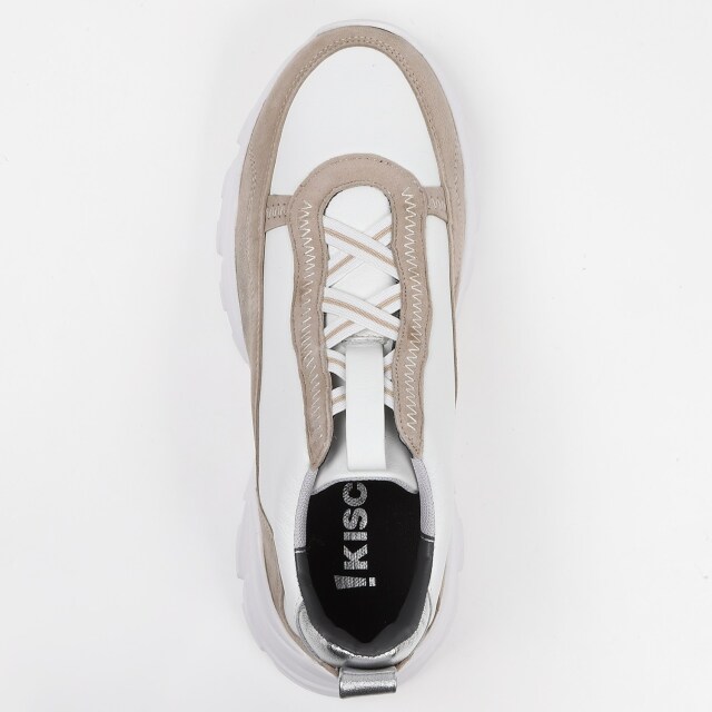甲のあしらったバイカラーのクロスゴムが目を引くハイカットスニーカー。千鳥ステッチの飾りでクラフト感をプラス。