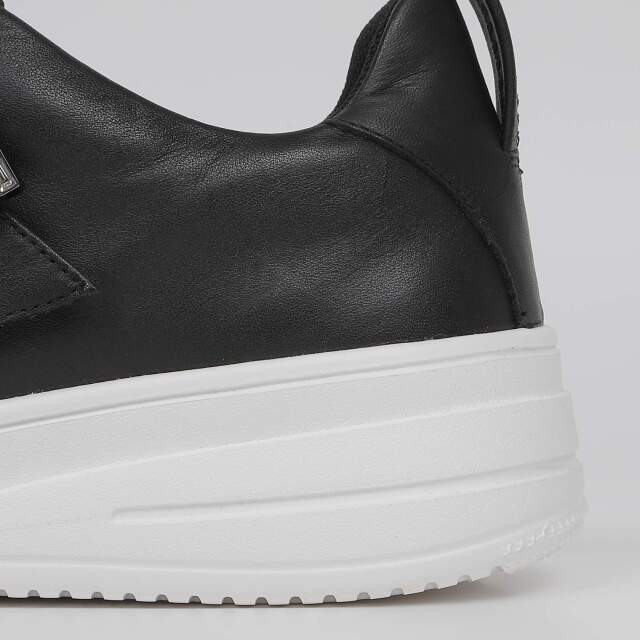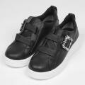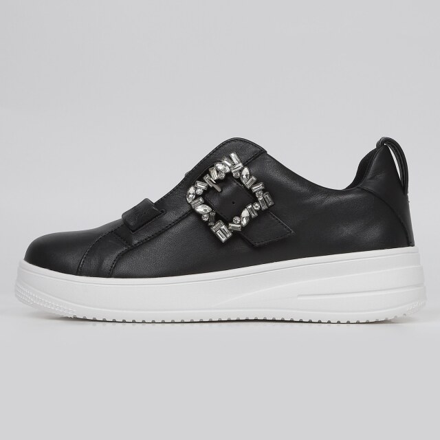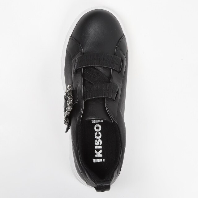 甲のシャーリングゴムがアクセント。このゴムの伸縮性で脱ぎ履きも楽々です。きらきら光るビジューバックルがスポーティーなスニーカーにエレガンスさをプラス。