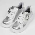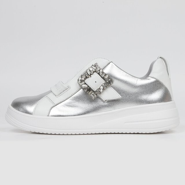 甲のシャーリングゴムがアクセント。このゴムの伸縮性で脱ぎ履きも楽々です。きらきら光るビジューバックルがスポーティーなスニーカーにエレガンスさをプラス。