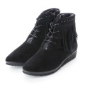 タッセル使いが決め手のなめらかな本革仕様で細やかなスタッズがシックで可愛いショートブーツです。ファスナー式で脱ぎ履きラクチンです。中敷がふわふわなファー仕様で足元をあたたかく包み込みます。チェック柄やモノトーンコーデにも合わせやすく幅広いコーディネートに活躍します。