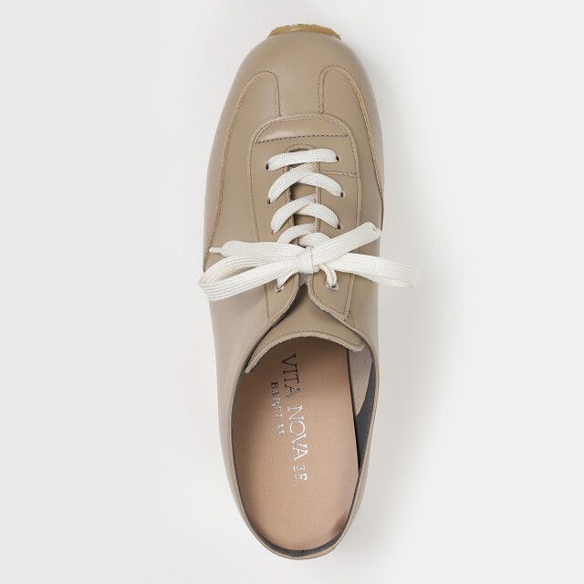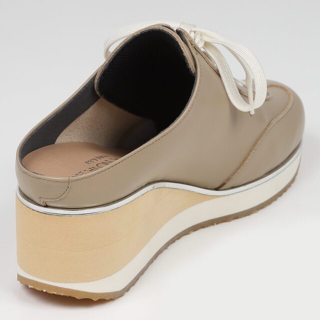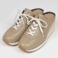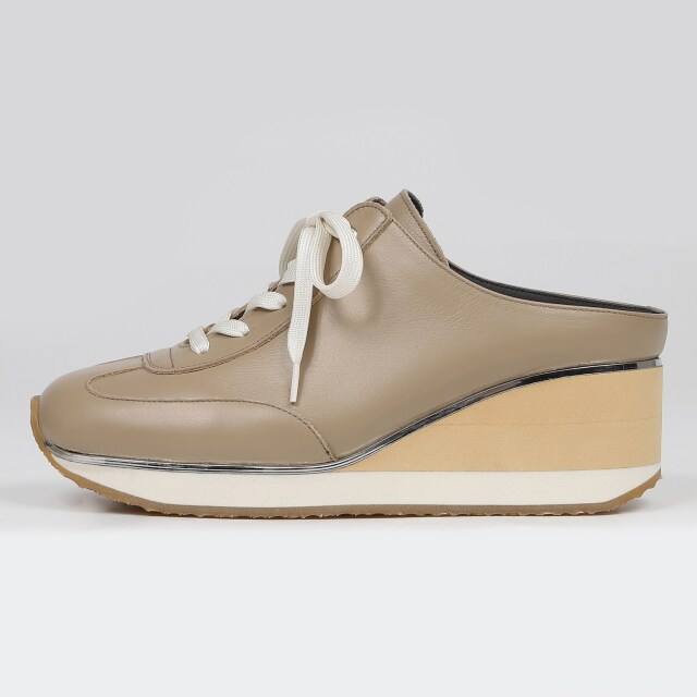 スニーカーテイストのミュール、「ミュールスニーカー」。今までありそうでなかったデザインは遊び心と履きやすさで大人の新しいスニーカー。胛が深いので脱げる心配もなく、ヒールアップされているので足をきれいに見せてくれます。パンツスタイルでは普通にスニーカーを履いている様にも見えます。スカート合わせも素敵にコーディネートできます。一年中履ける汎用性のあるデザインです。