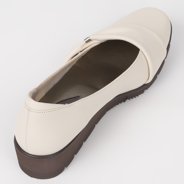 すっきりとしたシルエットで同素材のリボンのようなベルトを金具でクシュっとおさえたデザイン。着脱しやすく踵側にクッションが入ったノンストレスシューズ。