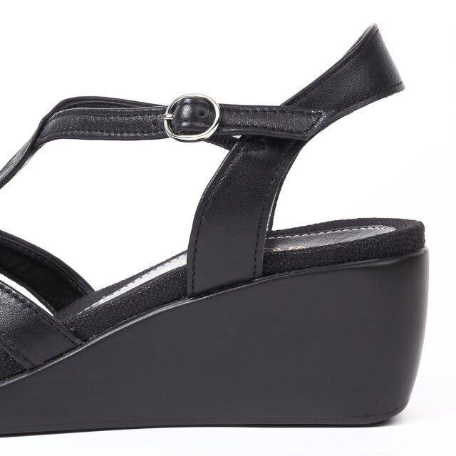 ホールド力のあるねじり風デザインのTストラップが、足を女性らしく華奢に演出。