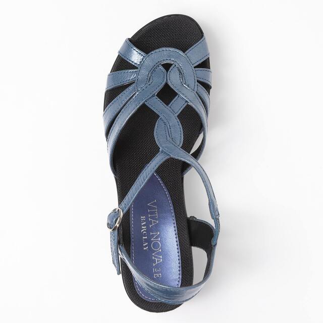 ホールド力のあるねじり風デザインのTストラップが、足を女性らしく華奢に演出。