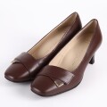 上品さとカジュアルさをうまく兼ね備えたヒールパンプス。くの字の金具がほどよいアクセント。