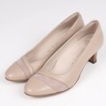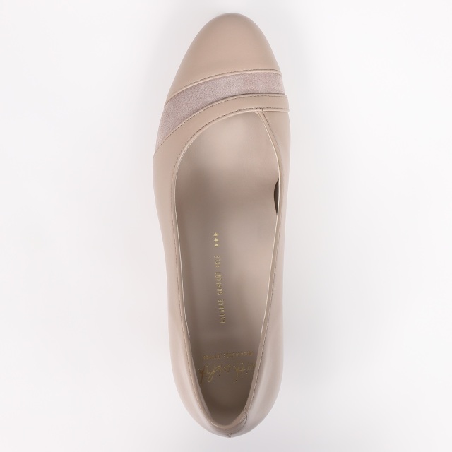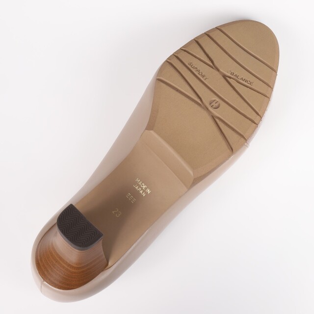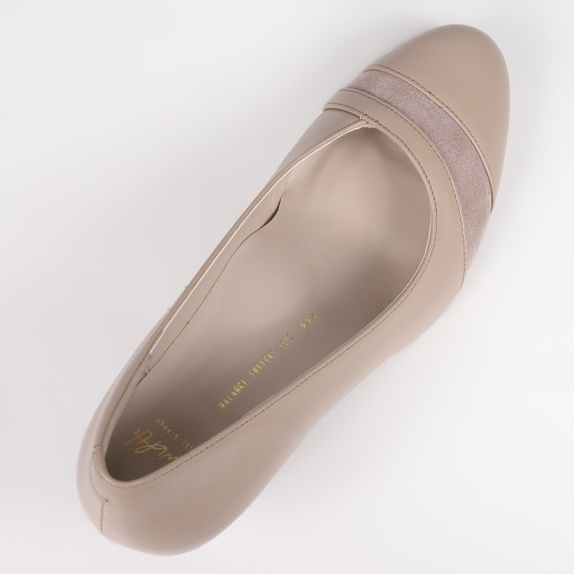 足を美しく見せてくれる甲のカッティング。ほんのり光沢のある、同色系の異素材のコンビがポイントに。売れ筋の定番ヒールとオリジナルソールで履きやすさを実感頂けます。